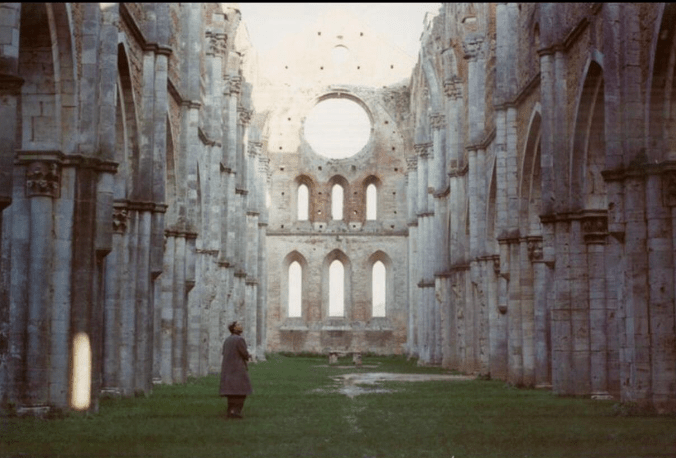 Returning to the film, which recounts the story of a Russian poet, Gorchakov, who journeys to Italy to research the life of a Ukrainian serf who became a renowned composer in Bologna, Italy in the 18th century, only to become stricken with nostalgia and return home to poverty and suicide. Tarkovsky himself left the Soviet Union, became exiled, separated from his wife, his son, his farm house, and subsumed with what he described as “the stifling sense of longing that filled the screen, which was to become …the painful malady within myself…my lot for the rest of my life.” One of the locations in the film includes the thermal baths of healing waters, made famous by St. Catherine of Siena, in which for centuries travelers would wade, for ailments of the liver, spleen, stomach and skin. The water was believed to be particularly effective for expelling “melancholy”. Entranced by the pool, Tarkovsky employed it as the locus of the movie. Gorchakov, who has a heart condition and is accompanied by an Italian translator named Eugenia who bears an uncanny resemblance to a Botticelli painting. Eugenia pines for everything she can’t have including the love of Gorchakov, while he yearns for his homeland. I remember viewing “Nostalgia’s” long meditative sequences, and feeling an array of emotions, but it was the six minute long, uninterrupted, unedited take of Gorchakov crossing the drained pool with a candle, despite the wind threatening to extinguish it, that had me on the edge of my seat. A single task being carried out and completed in real time. One forgets why they even started it, much like writing this blog, it becomes about the act itself… you’re in a constant present. When he finally succeeds, his heart promptly gives out…The final shot represents one man’s inner division being made whole at last… the hypnotic image of a gothic cathedral on a Tuscan hill and a Russian dacha merging into one, indissolubly. As Tarkovsky expressed, “It is a way of preserving time which in theory gives us the possibility of moving backwards, freely, eternally.” More on the power of memory and nostalgia as a motivating force in Parts 2 and 3 !
